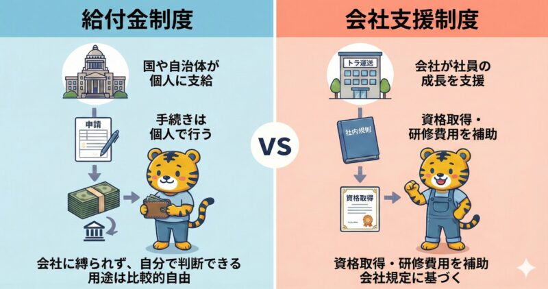 会社の免許取得支援制度と、国の給付金制度は性質が異なります。