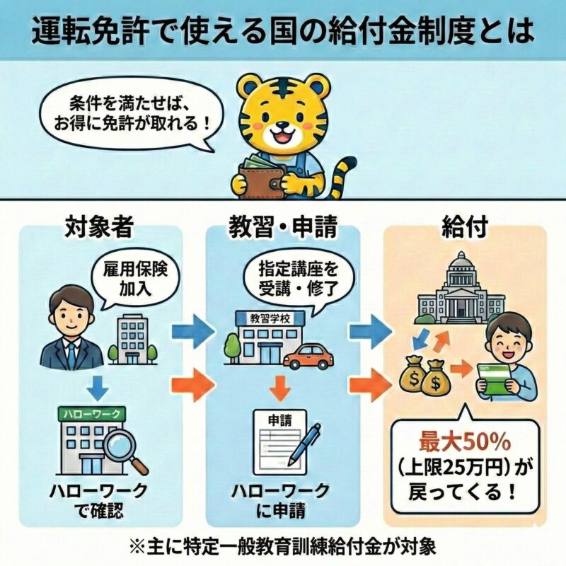 運転免許の取得には、会社の免許取得支援制度だけでなく、国の給付金制度という選択肢もあります。