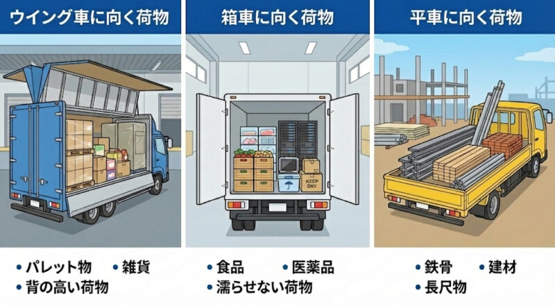 • ウイング車=横から作業できて効率が高く、パレット中心なら扱いやすい