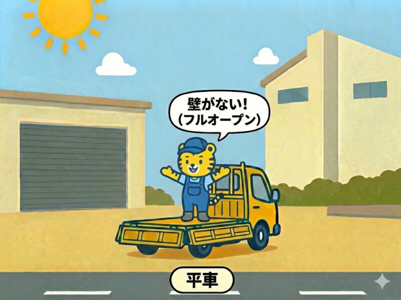 ウイング車・箱車・平車の構造の違いを、開き方と壁の有無だけで理解できる