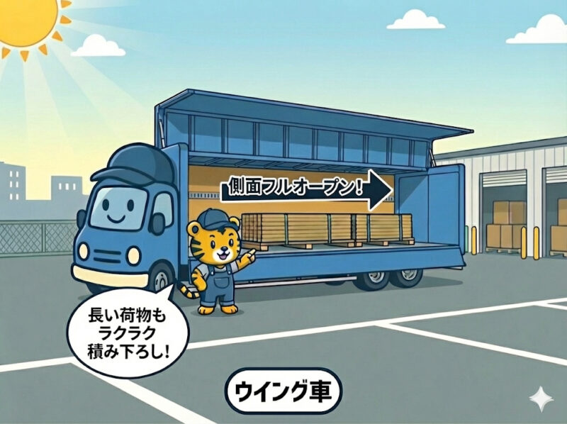 ウイング車は、側面が大きく開くことを前提に作られた車種で、パレット物を効率よく扱える構造になっています。