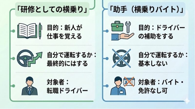 • 仕事内容は「研修としての横乗り」と「助手(横乗りバイト)」の2種類がある