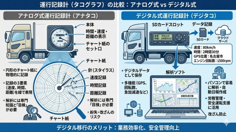 タコグラフには、アナログ式とデジタル式(デジタコ)の2種類があります。